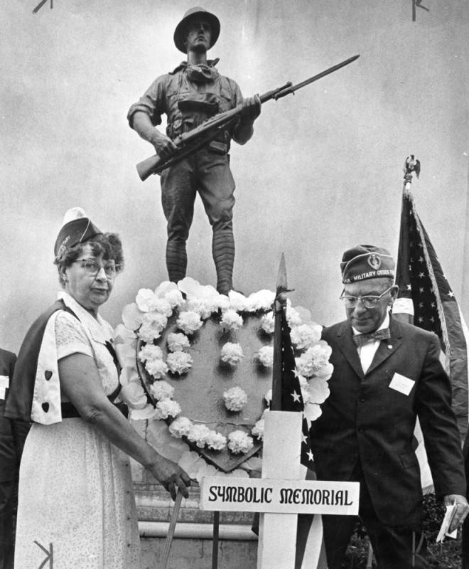 "Members of the Purple Heart Veterans Organization decorated a symbolic memorial at Court Freedom, Forest Lawn Memorial Park, Glendale, last Friday, in connection with the organization's meeting in Glendale. Left to right Lona Masterson, chaplain and Ralph Vollmer."