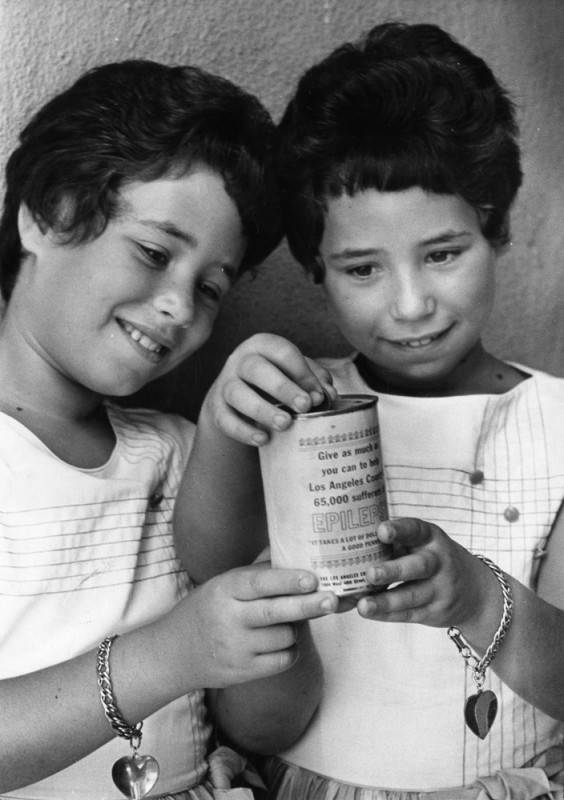 "Collectors - The Deutsch twins, Kathy, left, and Karen, deposit money they have collected for Epilepsy fund. Girls staged play, 'The Shoekinn Family and the Mystery of the Money,' for the charity."