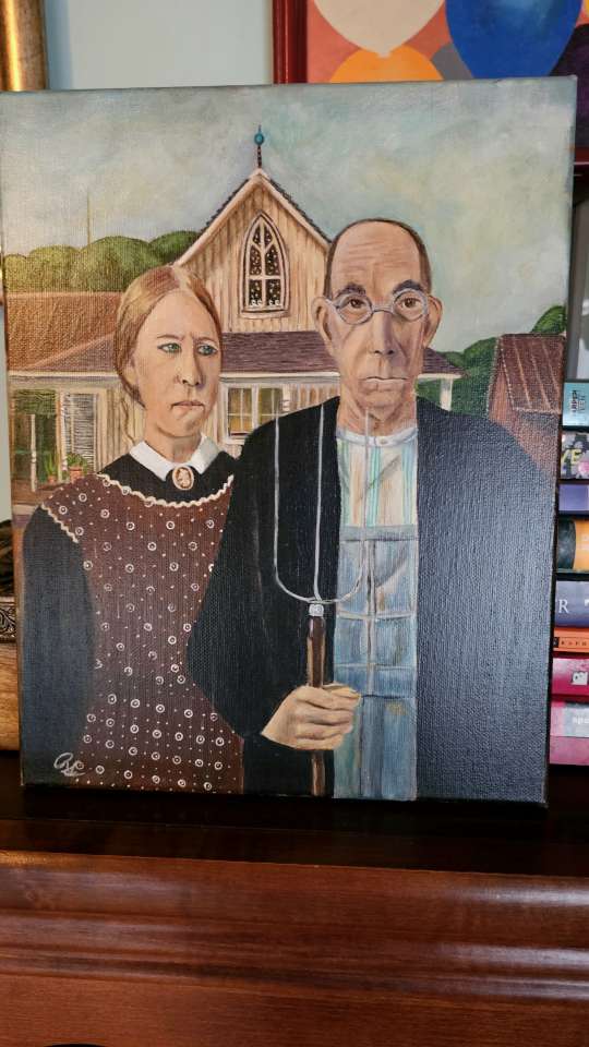 I love this painting! I love the way you've changed the faces. This couple appears to be upset by betrayal, reflective of the troubling times we live in. I love that the details are carefully hand-painted and not generated artificially. I'm sure your brother will love it. Good work! Thanks for sharing.