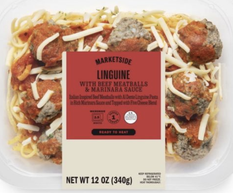 Walmart: “MARKETSIDE LINGUINE WITH BEEF MEATBALLS & MARINARA SAUCE” with multiple Sept-Oct 2025 “best by” dates.